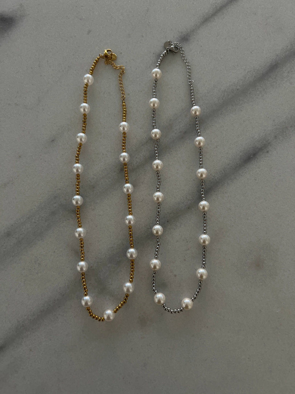 Simple pearls on a beaded chain, can be adjusted 16-18 inches. Great for layering with other necklaces. Crafted to be water resistant, this piece ensures longevity. To affirm our commitment to excellence, it comes with a lifetime warranty.