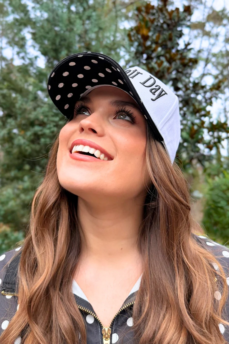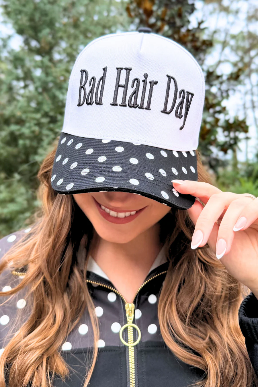 Rock your messy hair moments with confidence in this playful Bad Hair Day Hat. Featuring a crisp white base with black trim, a charming polka dot patterned bill, and bold puff embroidery spelling out "Bad Hair Day," this cap turns a hair emergency into a fashion statement. Perfect for those days when styling just isn't happening—wear it with attitude and a smile.