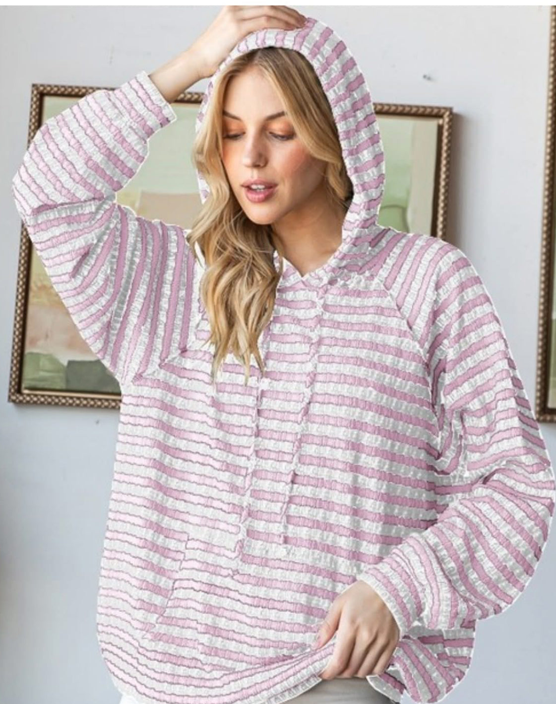 Cozy meets cute in this dusty pink and cream striped hoodie pullover. Made with a soft, textured knit feel and an easy relaxed fit, it’s the kind of throw-on-and-go top that still looks styled. The roomy hood and comfy long sleeves give it that laid-back weekend vibe, while the pretty neutral stripes keep it looking fresh and feminine. Pair it with your favorite denim or leggings for an effortless, comfy-chic look you’ll reach for on repeat!!