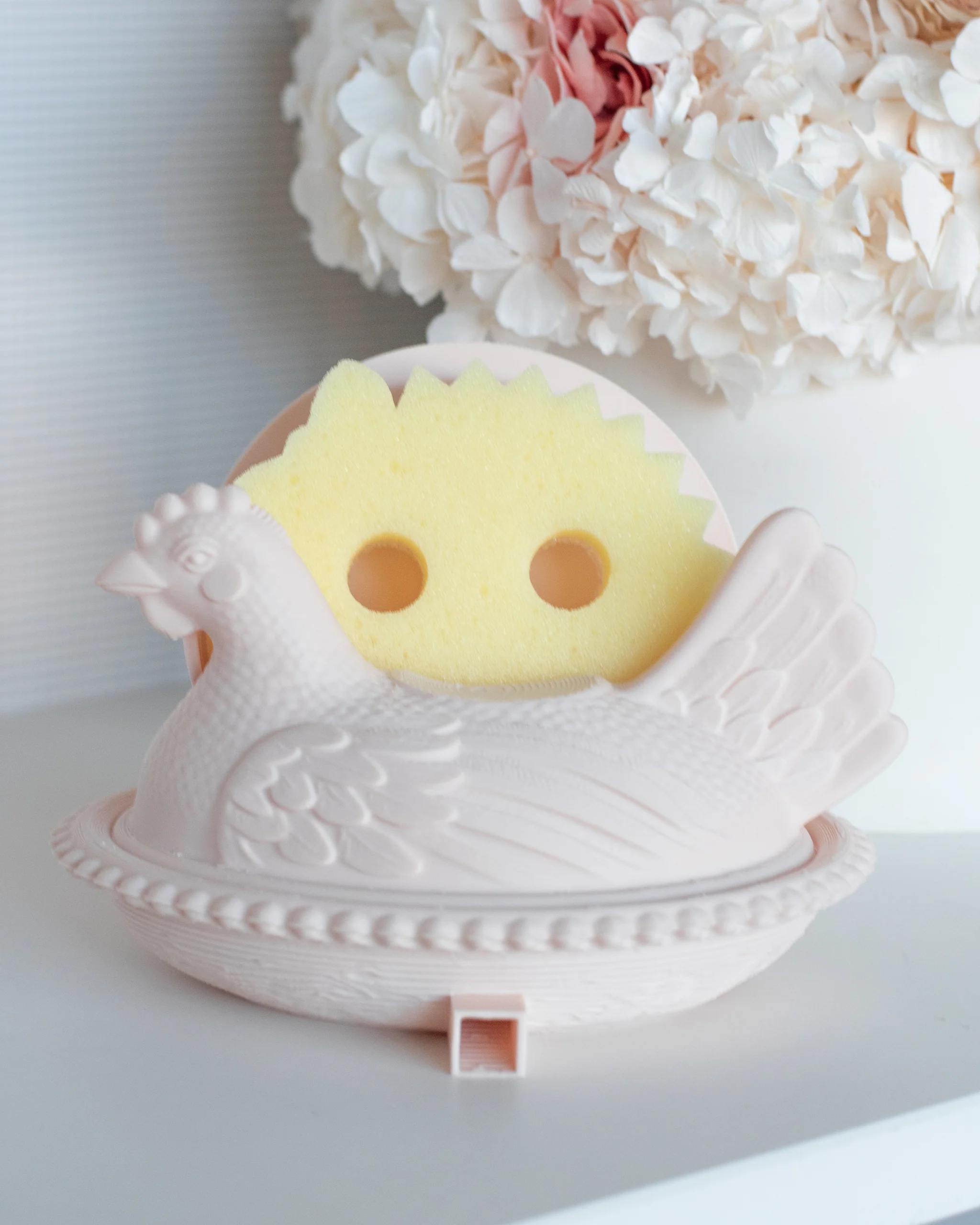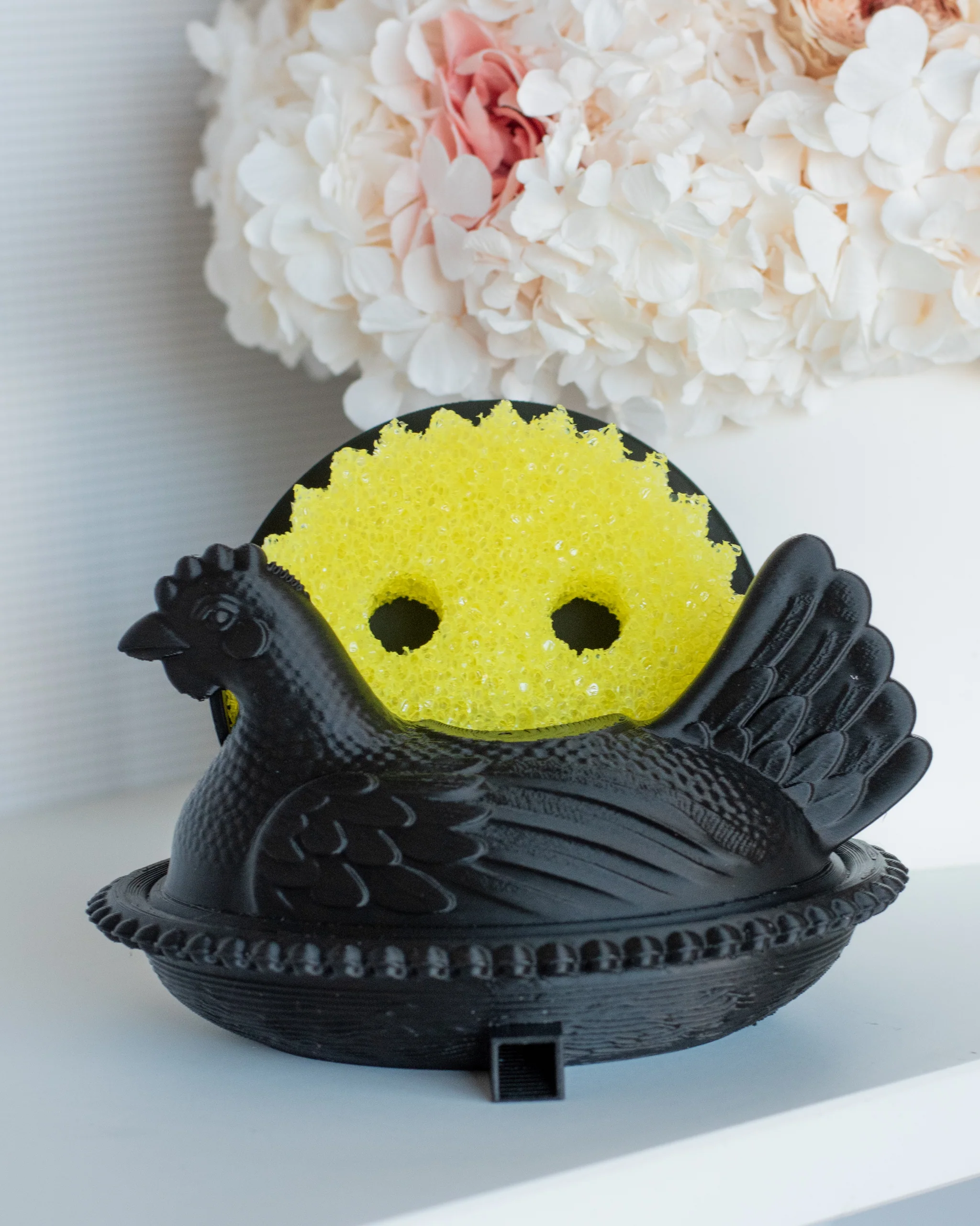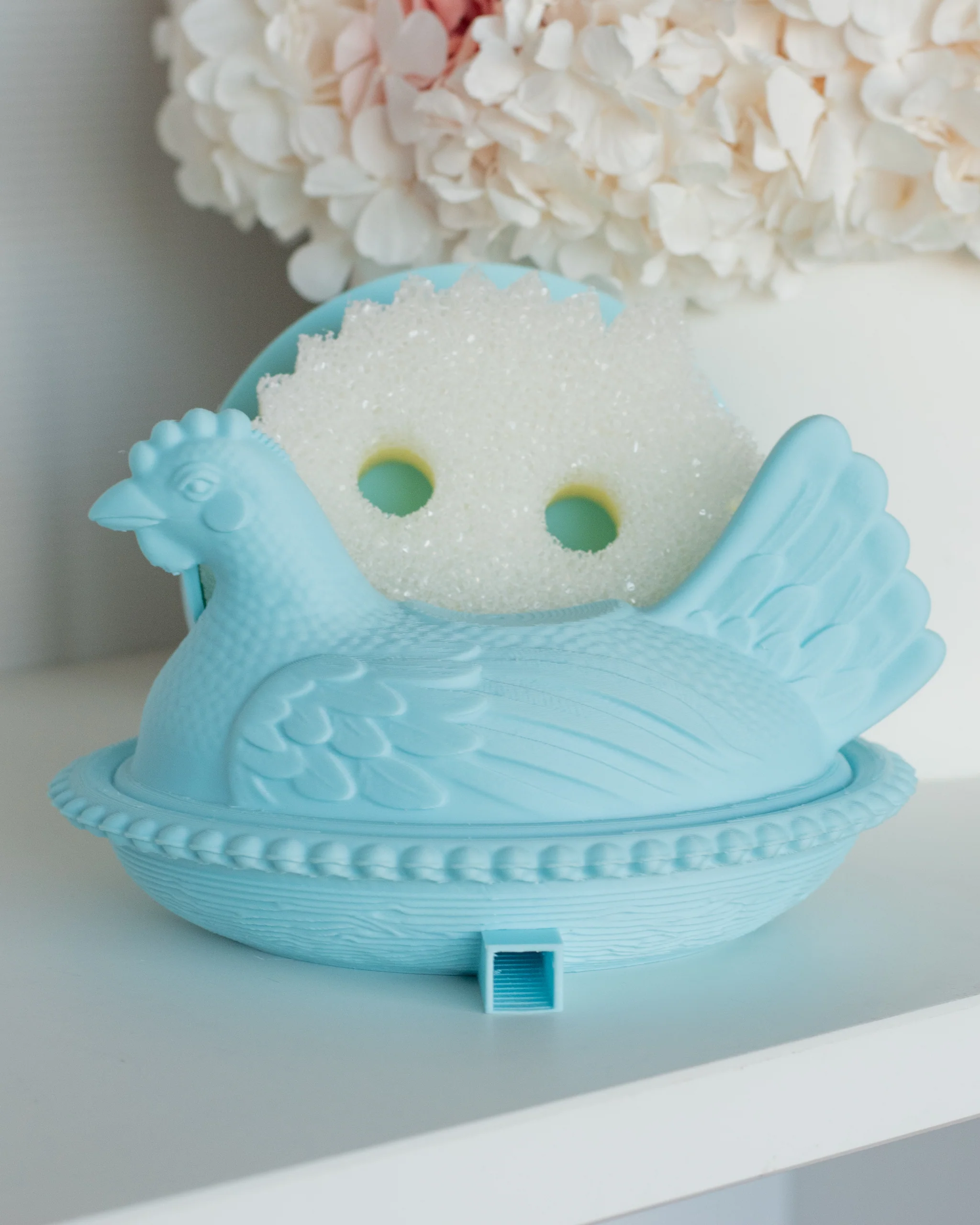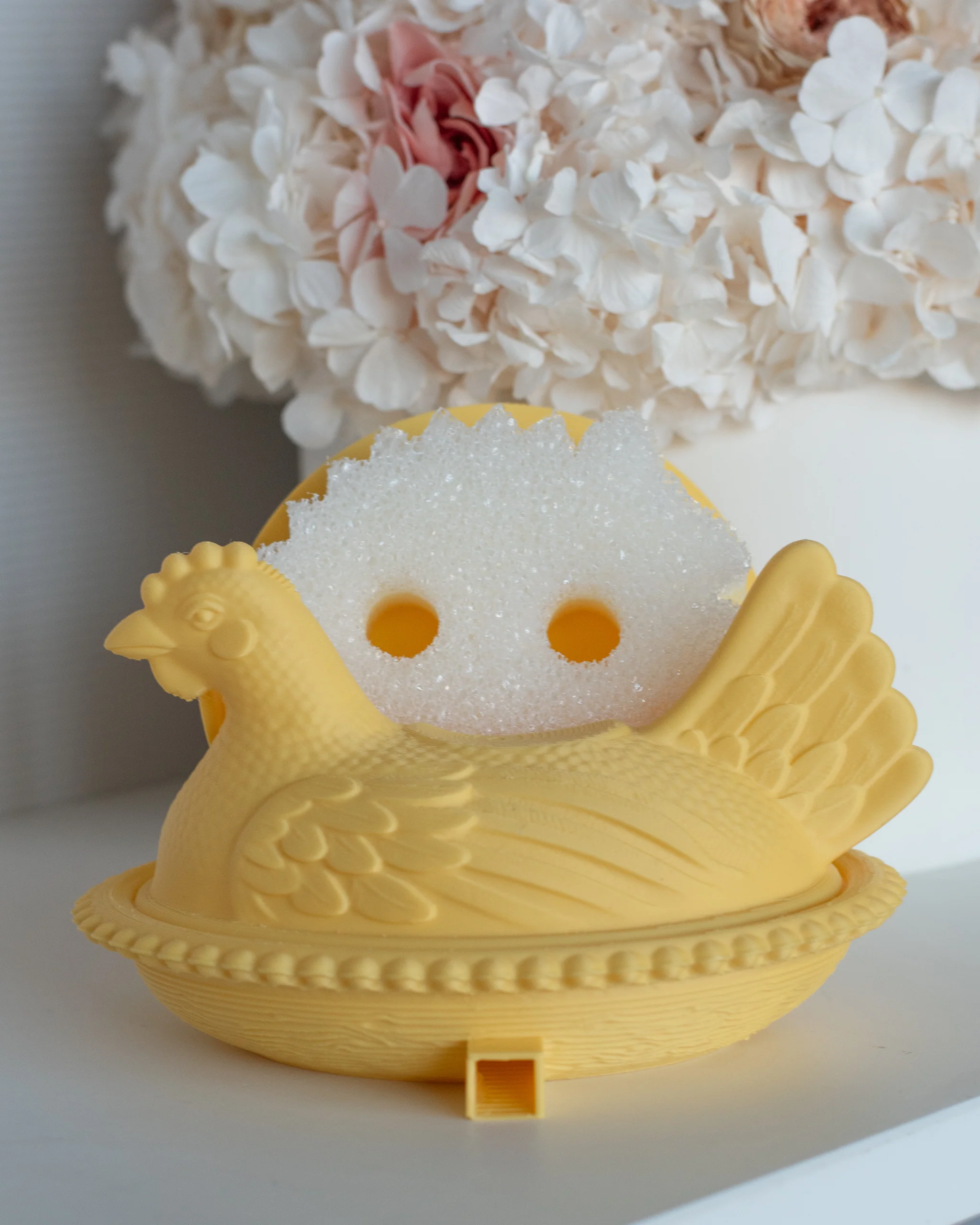 This charming nesting hen is designed to perfectly cradle your favorite smiley scrub sponge, keeping it upright, dry, and ready for action. No more soggy sponges slumped on the counter! This little hen keeps things tidy and adorable.
