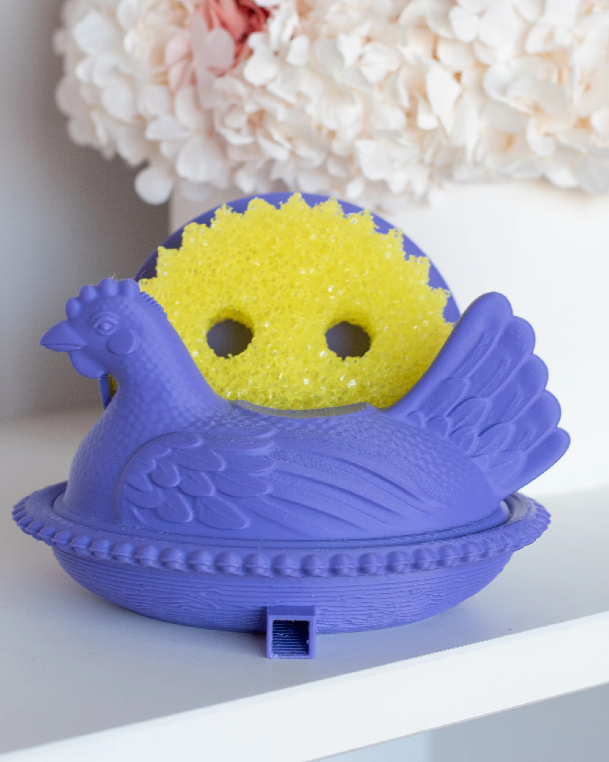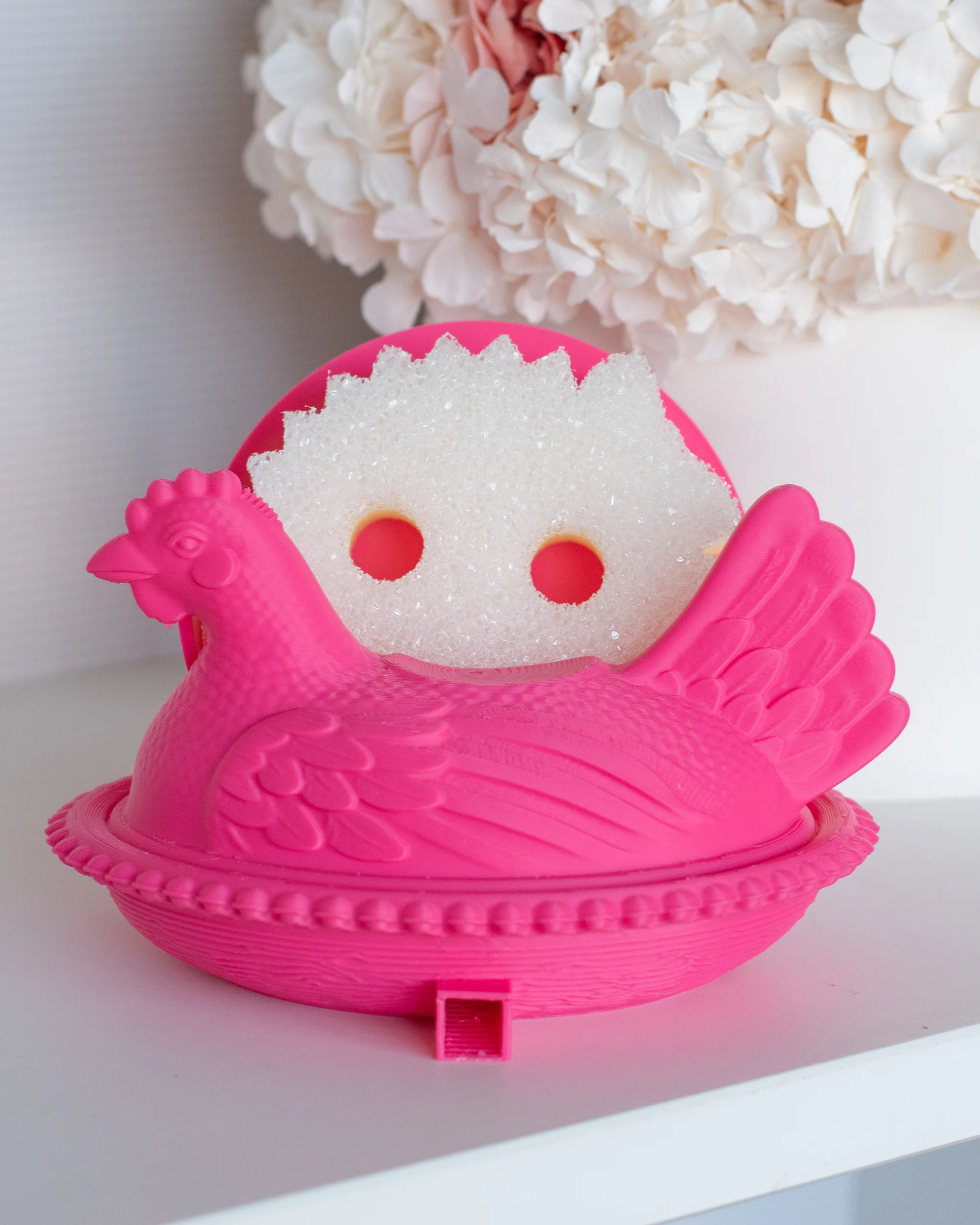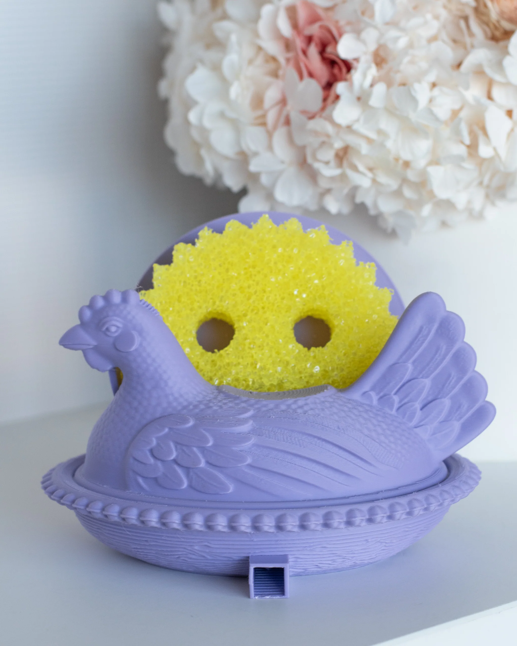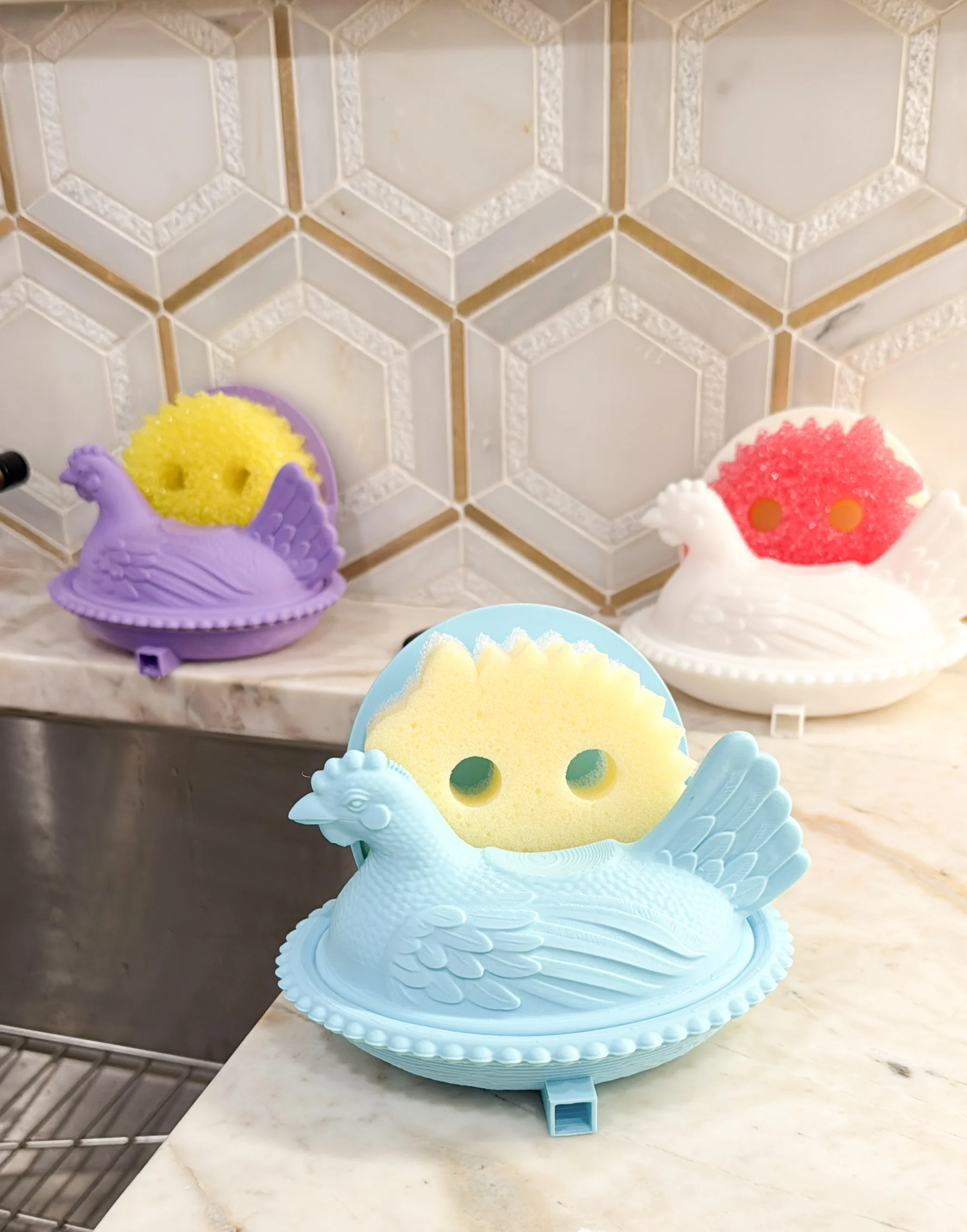 This charming nesting hen is designed to perfectly cradle your favorite smiley scrub sponge, keeping it upright, dry, and ready for action. No more soggy sponges slumped on the counter! This little hen keeps things tidy and adorable.