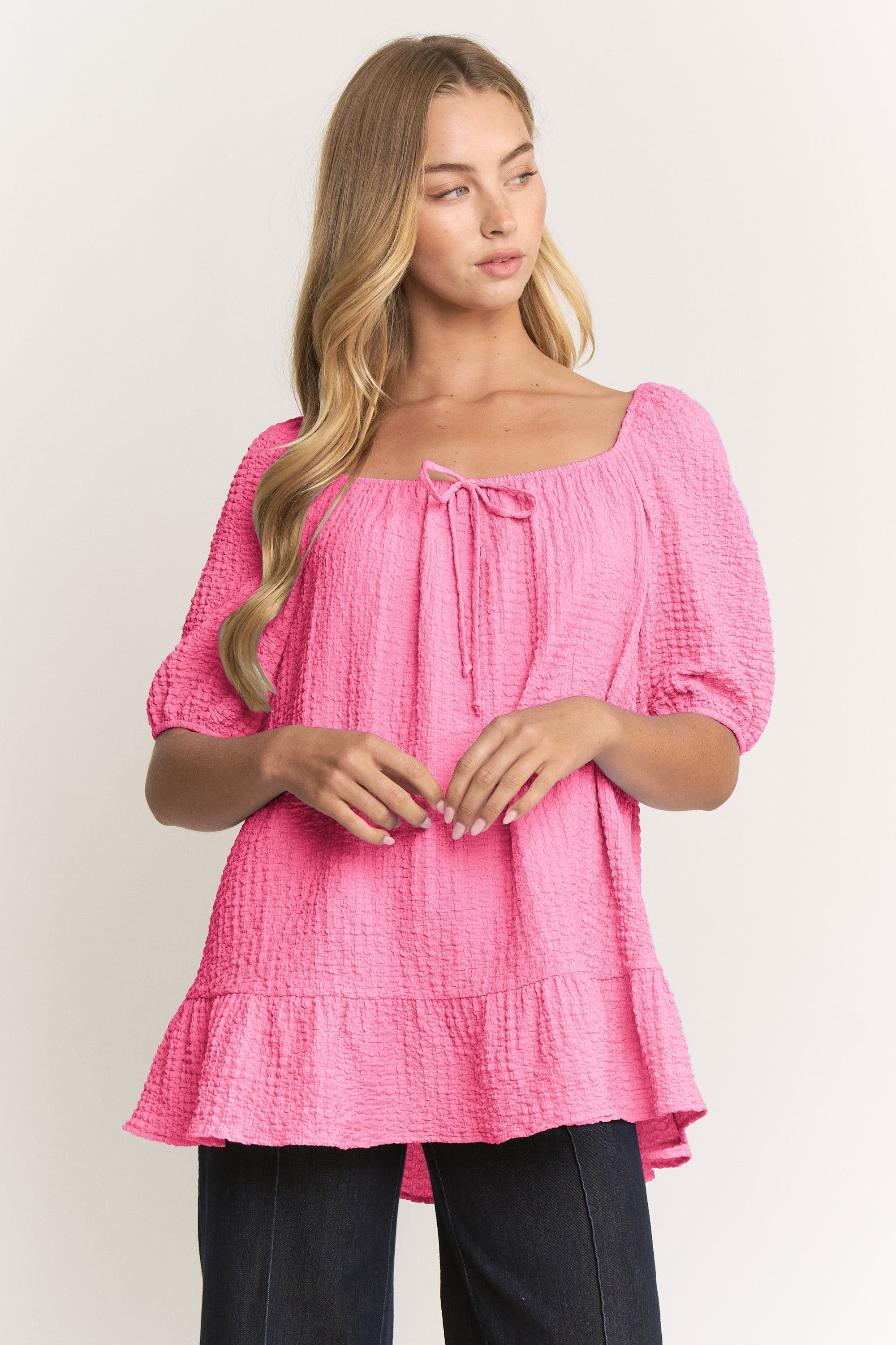 95% POLYESTER 5% SPANDEX SHORT PUFF SLEEVE SQUARE NECK TEXTURED KNITTED TOP WITH FRONT TIE AND RUFFLE HEM DETAIL