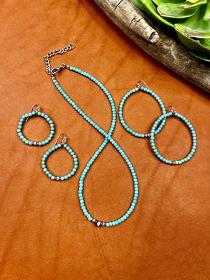The Crockett Small circle earrings are the smallest in our line at only 1.25 inch diameter. Small turquoise-colored beads surround one silver bead in the center. Nickel Free & Hypoallergenic.